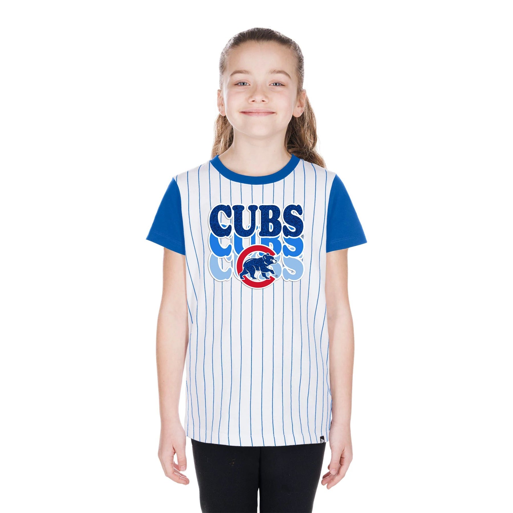 Chicago Cubs New Era Youth Walking Bear Triple Wordmark Pinstripe Tee Short Sleeve Tees NEW ERA CAP COMPANY INC